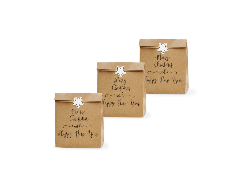 Darujte letos dárky originálně a zabalte je do našich dárkových sáčků s vánoční tématikou. Vyrobené jsou z kraftového papíru a díky své velikosti 25x11x27 cm tam můžete dát jeden větší nebo klidně více menších dárků. Každý sáček má černý nápis Merry Christmas and Happy New Year (Veselé Vánoce a šťastný nový rok). Součástí jsou také samolepící bílé hvězdy, aby bylo možné sáček uzavřít. Jedno balení obsahuje 3 ks sáčku (velikost 25x11x27 cm) a tři hvězdy (velikost cca 5,5 cm).