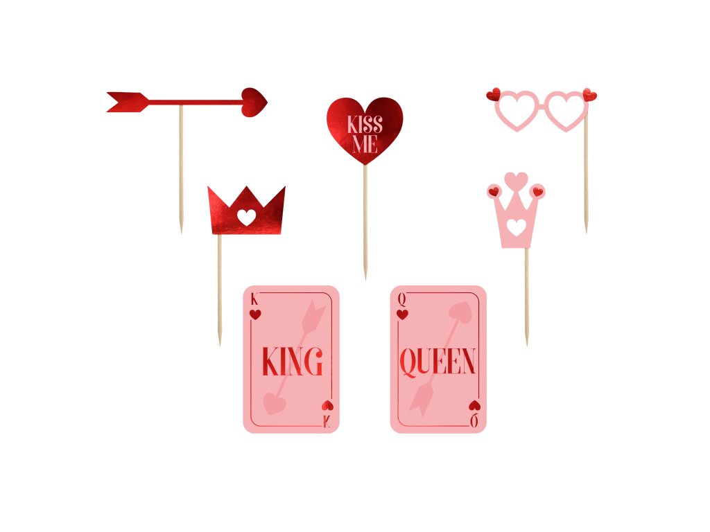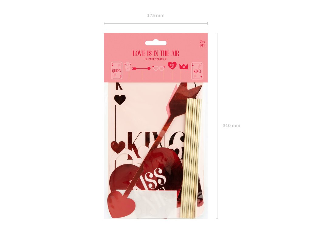Sada obsahuje 7 různých rekvizit: srdce s nápisem “Kiss me”, korunku, korunu, šipku, kartu s nápisem “King”, kartu s nápisem “Queen” a brýle ve tvaru srdce.