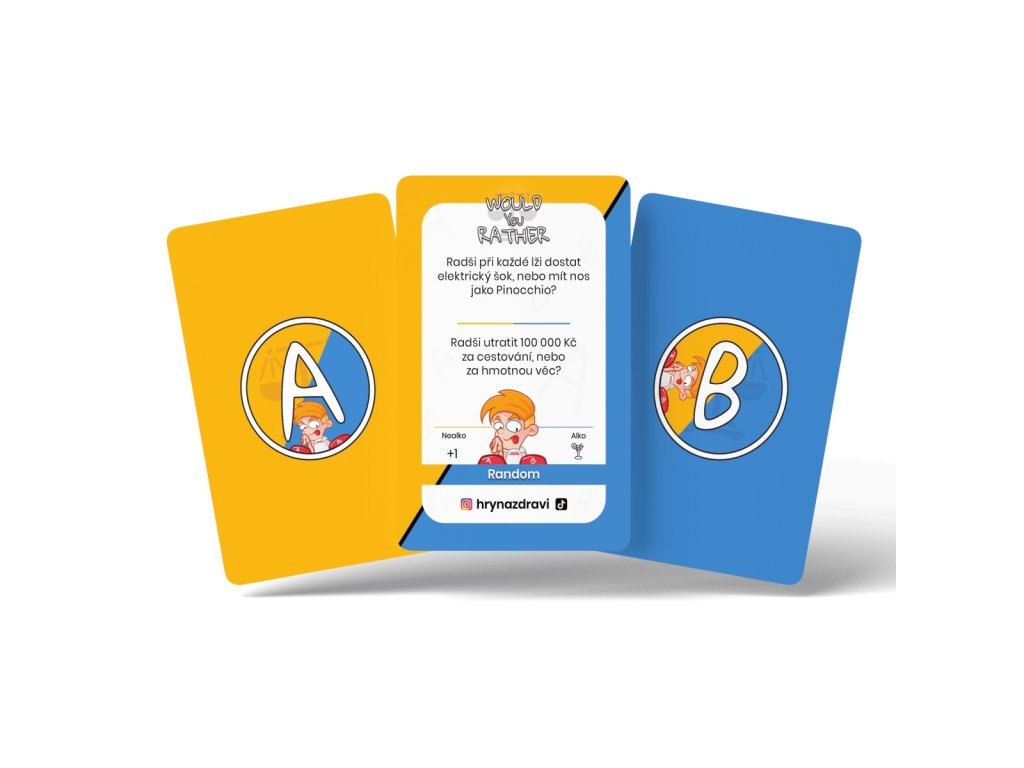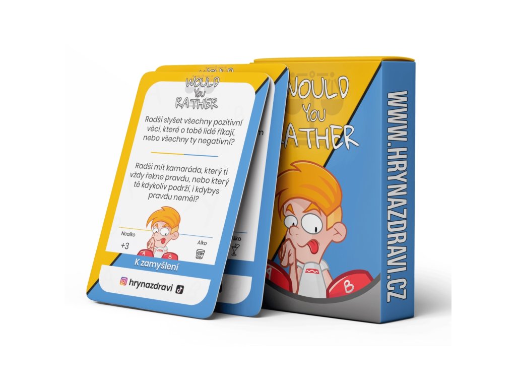 Princip hry: Lízneš si kartu a musíš si vybrat 1 ze 2 možností. Např.: “Radši slyšet všechny pozitivní věci, které o tobě lidé říkají, nebo všechny ty negativní?” Pokud nejsi ve většině piješ/nezískáváš bod.