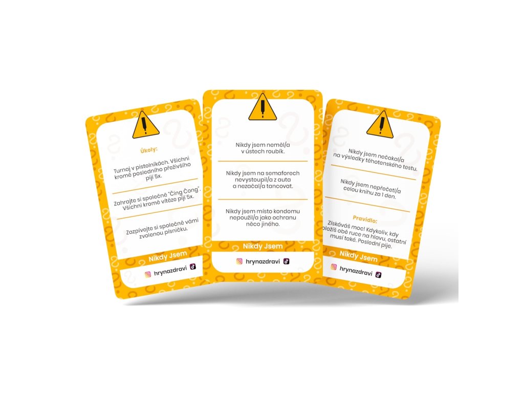 150 otázek "Nikdy Jsem" v 1 balíčku! Konec nekonečného hledání a trapného ticha! + 15 extrapravidel a úkolů, alko i nealko pravidla, mini velikost, několik druhů otázek včetně ultra spicy!