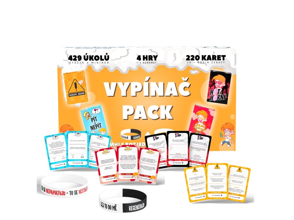 Vyběhněte ze šedi obyčejných večírků a vstupte do světa, kde je zákaz nudy a to doslova. Vypínač PACK je ultimátní karetní párty set, který obsahuje čtyři bestsellerové hry, díky nimž proměníte každý stůl v arénu smíchu, přiznání a miniher.