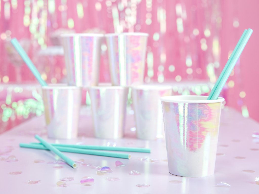 Papírové kelímky jsou vhodné na všechny druhy oslav. Pokud připravujete tématickou oslavu, rozhodně byste neměli zapomenout na tyto krásné papírové kelímky v lesklém duhovém odstínu. Kelímky lze využít ale i na jakoukoliv jinou oslavu, jejich vzhled jistě zaujme všechny hosty. Zakoupit můžete také konfety ze stejné kolekce.
