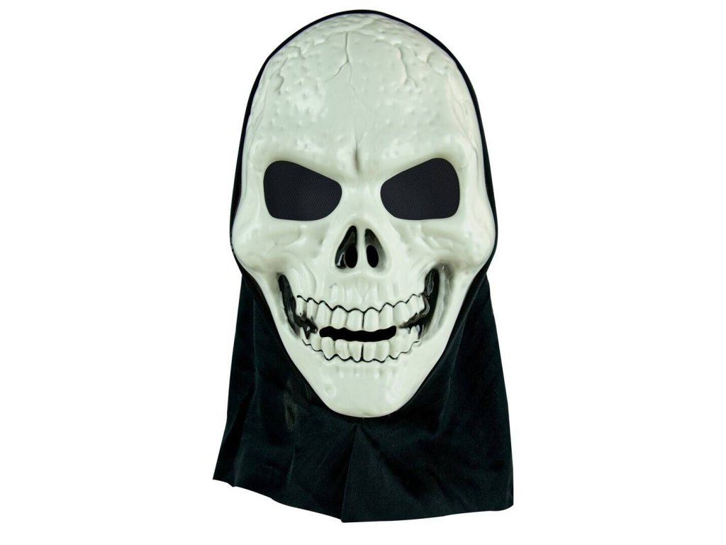 Černá látka, která masku obepíná, dodává vzhledu tajemný a děsivý rozměr. Zakrývá krk a ramena, takže to vypadá, že lebka doslova levituje ve tmě. Maska je ideální pro Halloween, hororové párty, průvody duchů i kostým Smrtky.