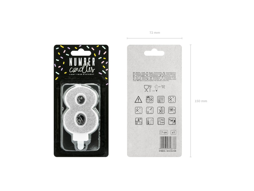 Na žádném narozeninovém dortu by neměly chybět svíčky, každý chce sfouknout svíčky a něco si přát. Stříbrné svíčky se lehce třpytí a jsou ve tvaru číslice “8”. Vypadat famózně budou na čokoládovém i ovocném dortu. Číslice můžete různě kombinovat, proto můžete oslavit 8. narozeniny vaší ratolesti i 88. narozeniny vašich prarodičů.