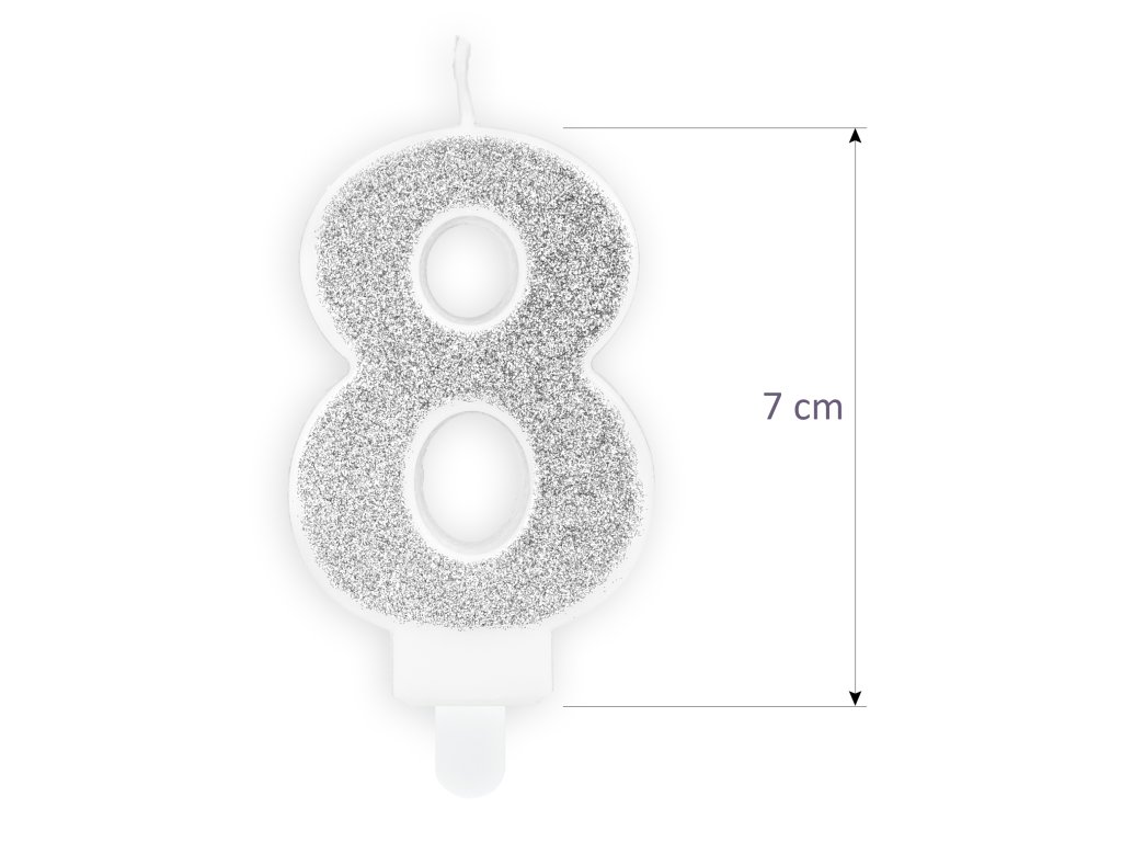 Narozeninová svíčka třpytivě stříbrná "číslo 8", 7 cm