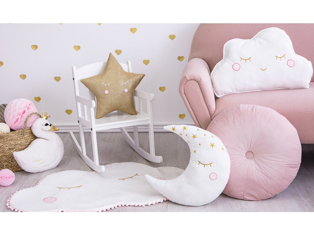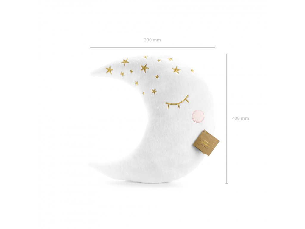 Plyšový polštářek ve tvaru měsíčku je bílý s vyšitými decentními doplňky ve zlaté a růžové barvě. Měsíček působí ladně a klidně, proto by usínání nemělo být žádným problémem. Svým tvarem je to vhodný parťák také k obejmutí, protože je měkoučký a mazlivý. A pokud se s polštářkem zrovna nikdo nemazlí, posaďte ho na postel v dětském pokoji nebo ložnici. Své místo najde i v obýváku, je to přeci polštářek. Rozměry polštářku jsou 39 x 40 cm.